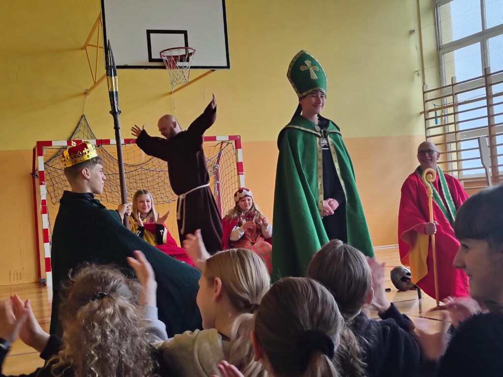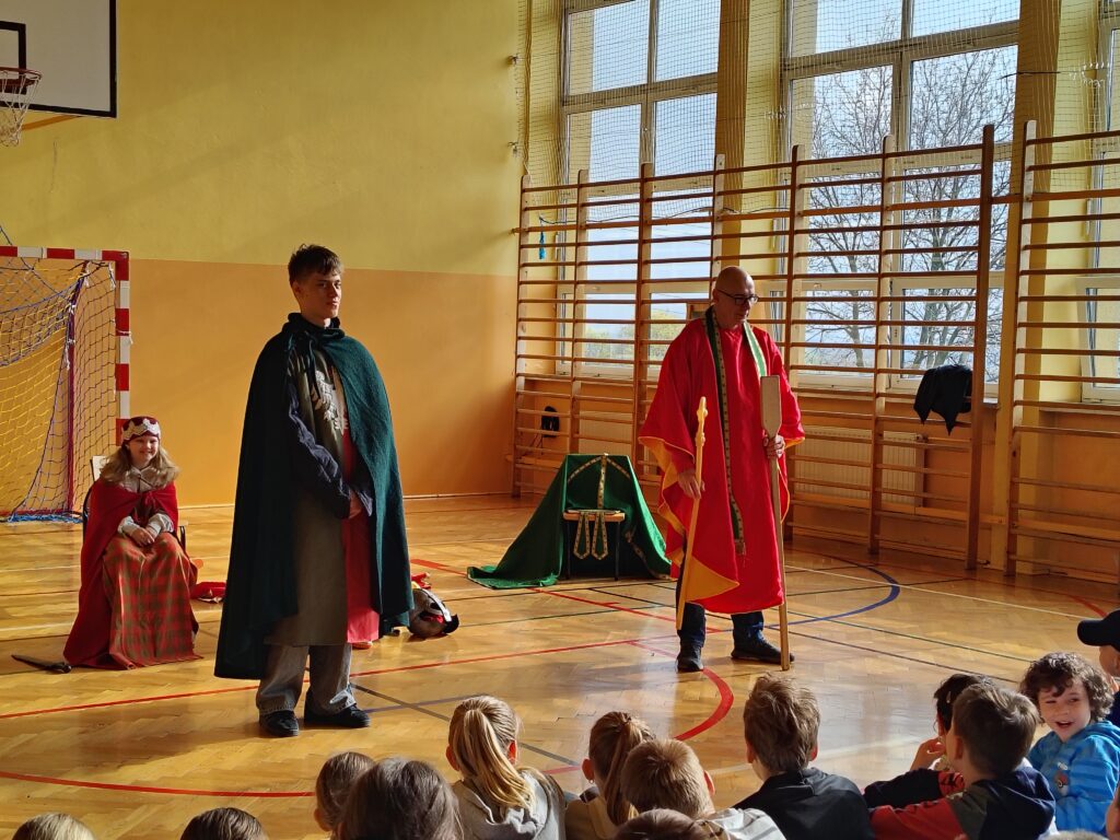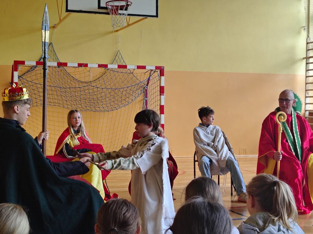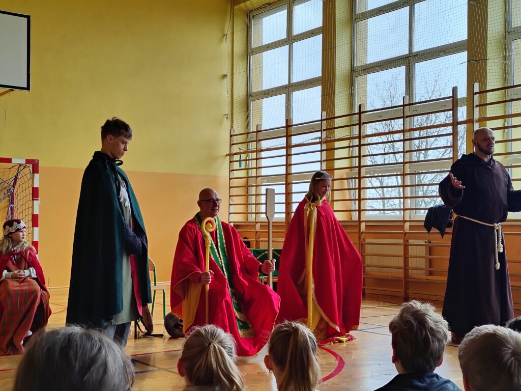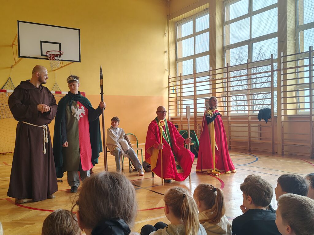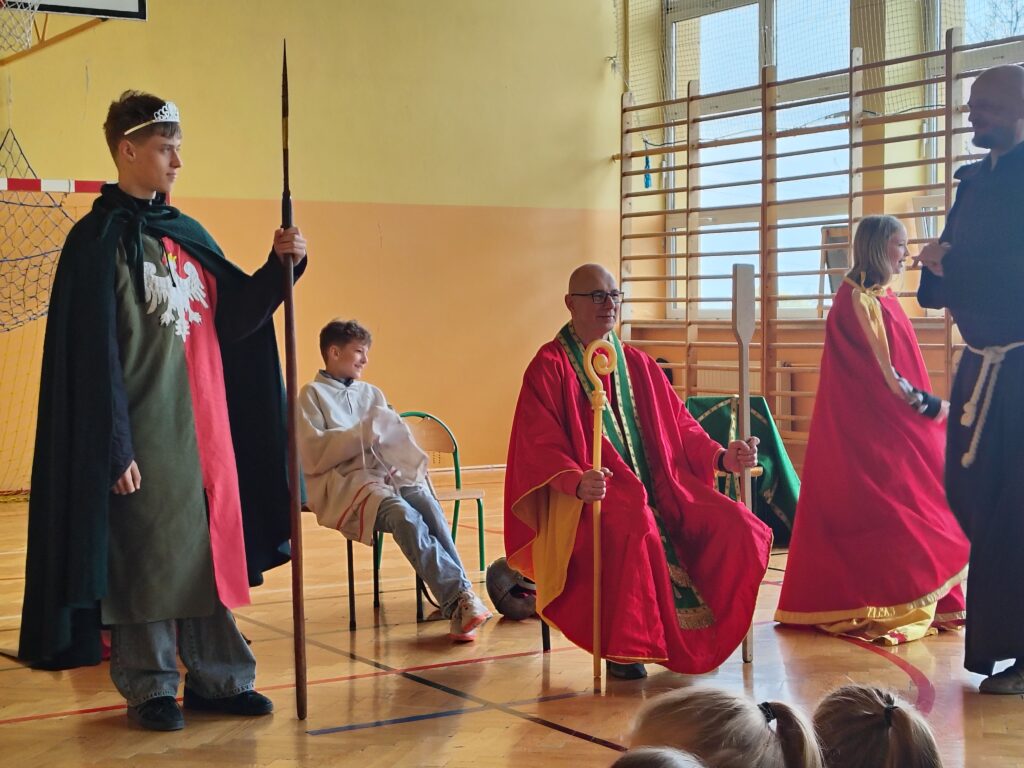 21.04 2026 roku w związku z 1060 rocznicą chrztu Polski i polskiej państwowości odbyła się w naszej szkole żywa lekcja historii. Tematem był chrzest Polski, misja chrystianizacyjna św. Wojciecha, zjazd w Gnieźnie i koronacja Chrobrego. Lekcja miała charakter interaktywny, wielu uczniów było zaangażowanych w inscenizacje w/w wydarzeń. Mamy nadzieję, że historia przedstawiona w takiej formie zapadnie uczniom na długo w pamięci.